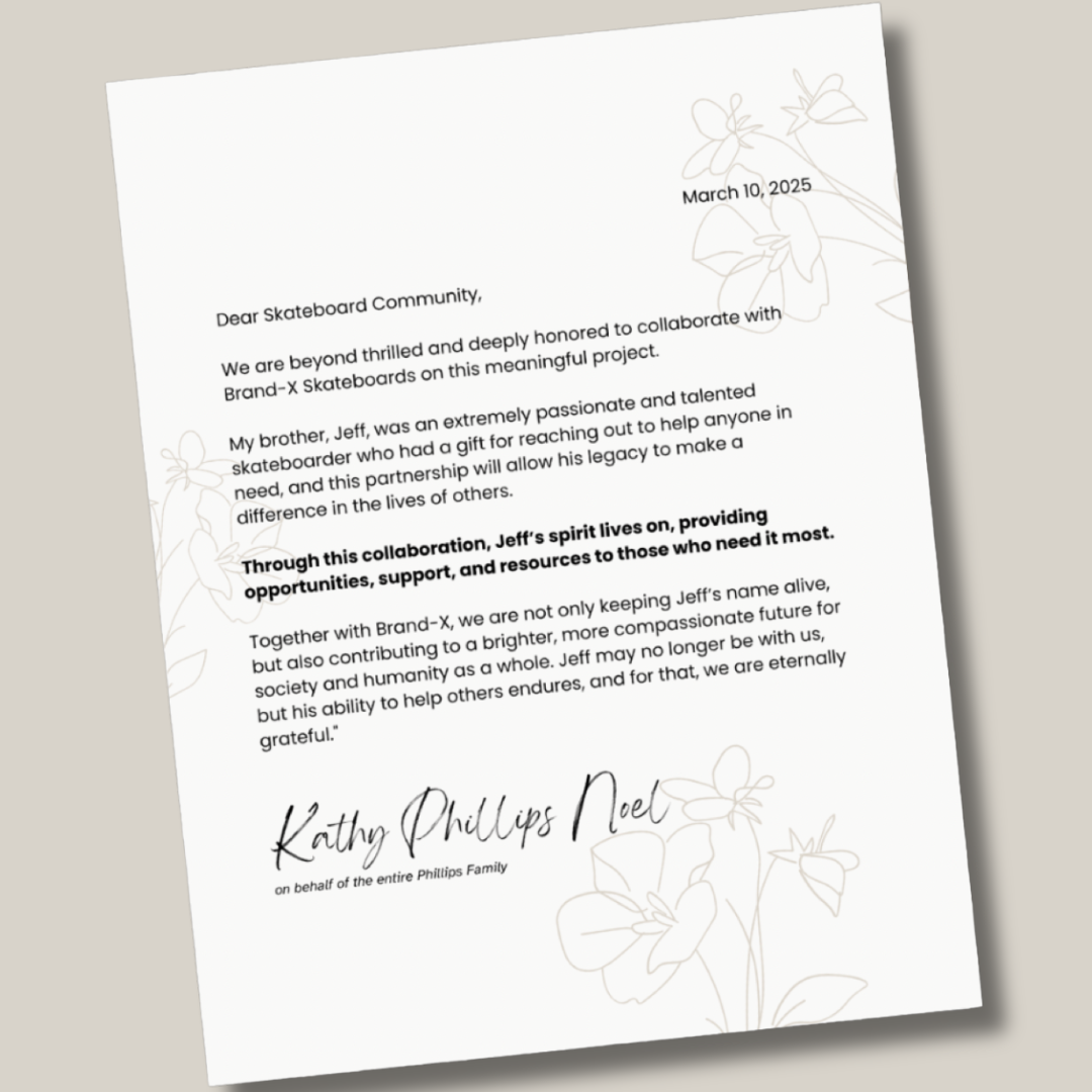 Proceeds from this product are being donated by Brand-X Skateboards to non-profit organizations that empower youth through sports, which were hand selected by Jeff’s family.. READ THE LETTER FROM JEFF'S SISTER Kathy, in the pictures.